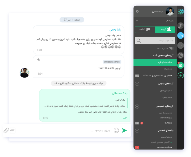 ارتباطات داخل محیط کاری خود و حتی ارتباطات کاری بینسازمانی خود را در داخل گروههای گفت و گو انجام دهید؛ سریع، بیدرنگ و تقسیمبندی شده. به راحتی در میان همه پیامها جست و جو کنید. هر نوع فایلی را در میان گفت و گو ارسال کنید و در یک جمله همهی ارتباطات کاری سازمان خود را در یک جا مدیریت کنید.